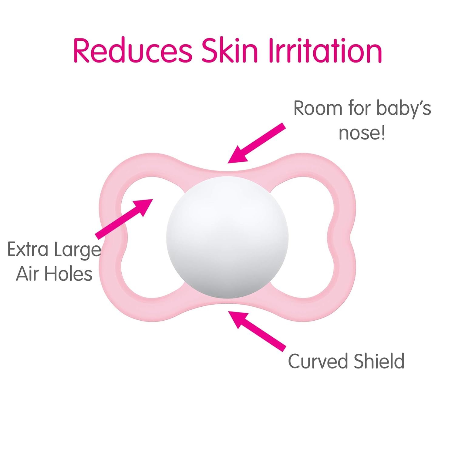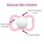 DESIGNED FOR BABIES WITH SENSITIVE SKIN: Large open air holes on silicone pacifier allows for maximum airflow to the face so sensitive skin can breathe.
