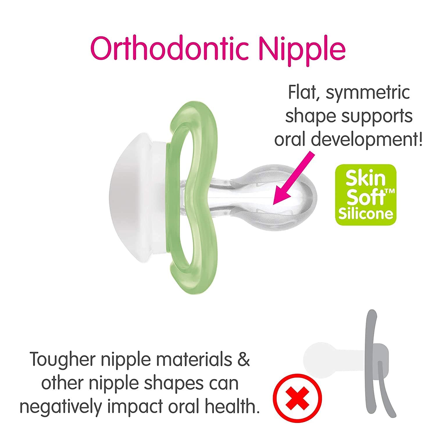 SYMMETRICAL SILICONE PACIFIER: The BPA-free silicone pacifiers for breastfed babies are made with our silky SkinSoft material and a symmetrical design that’s ideal for jaw and teeth development.