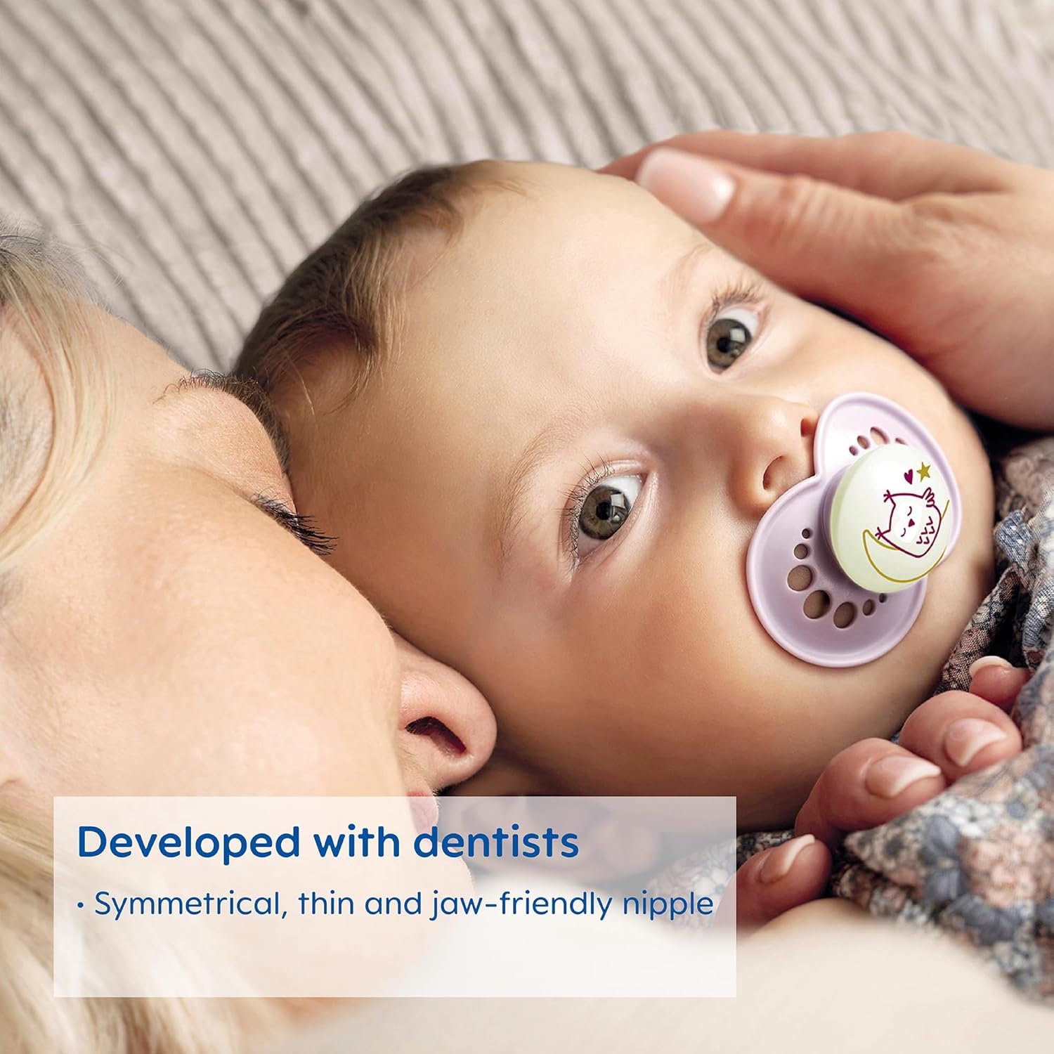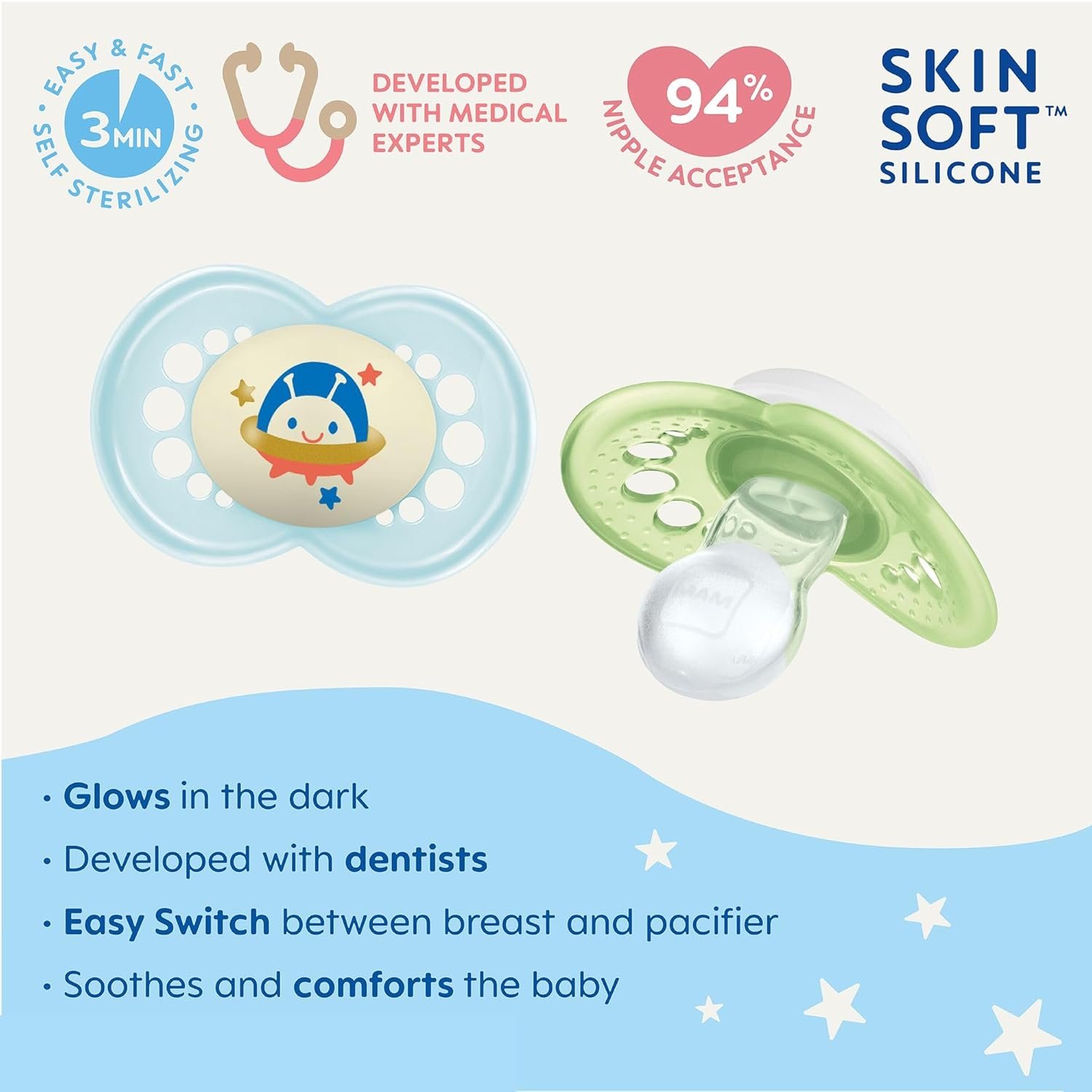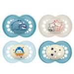 This pack includes 4 cute daytime silicone pacifiers and one that glows in the dark, making it easy for baby and parent to find in the dark. BPA/BPS-free MAM Day & Night Pacifiers were developed by leading pediatric dentists and developmental psychologists to provide maximum comfort and style for babies 6 months of age and older*. These pacifiers combine technological innovation and trendsetting design to help give babies a healthy start in life, such as our innovative nipple designed to promote healthy oral development so you can soothe your baby with confidence. Your baby will love latching onto the breastfeed pacifier nipple that, with the help of a built-in air channel, naturally flattens and extends when sucked, mimicking a human nipple during breastfeeding. As well, all MAM baby girl and boy pacifiers are orthodontic, featuring a symmetrical nipple that fits perfectly in baby’s mouth at any angle and life-like, SkinSoft textured silicone that feels just like mom. MAM nipples are easily accepted by babies of all ages, with 94% nipple acceptance among babies tested.** *Developed in conjunction with the International Children’s Medical Research Society. **Market research 2010-2020, tested with 1,572 babies