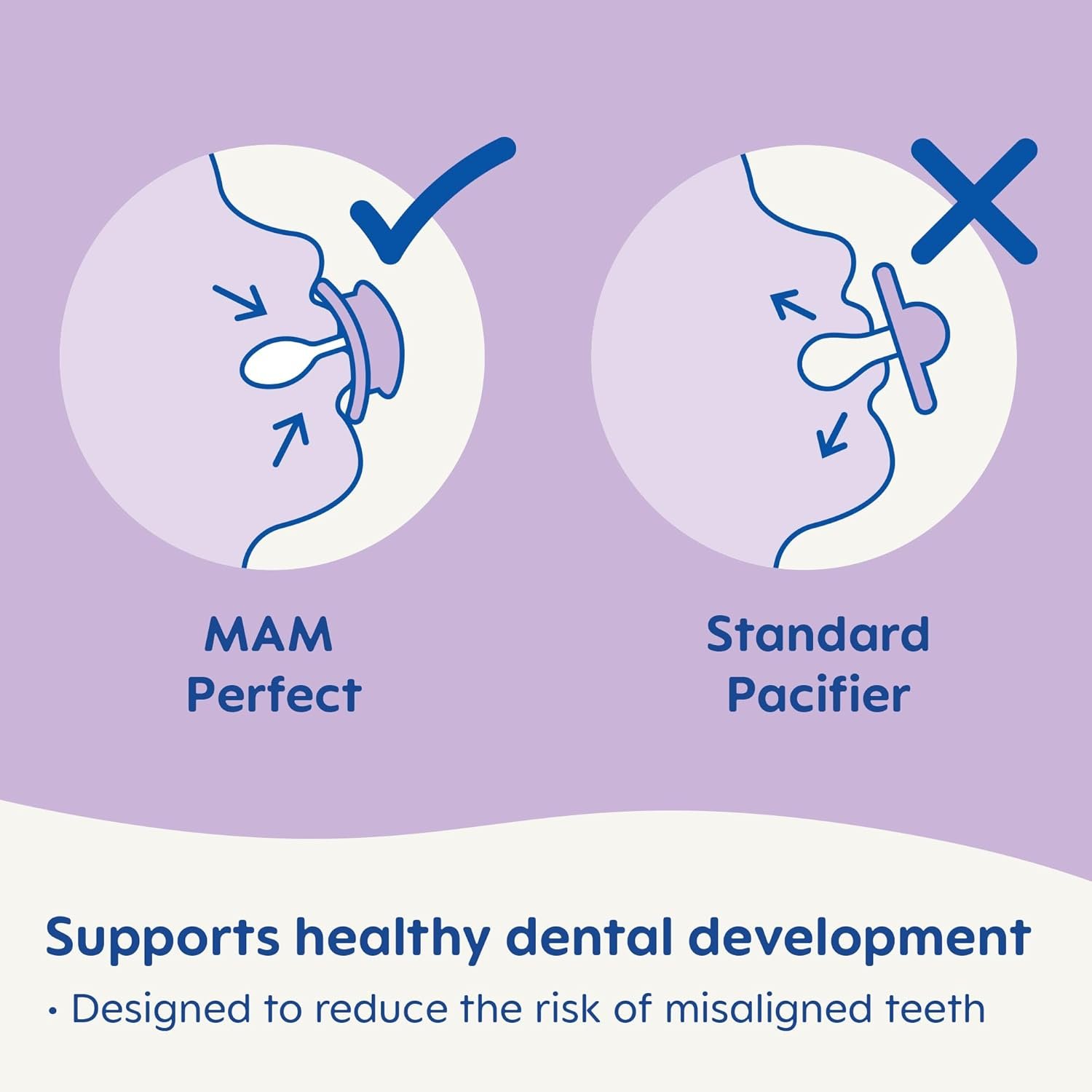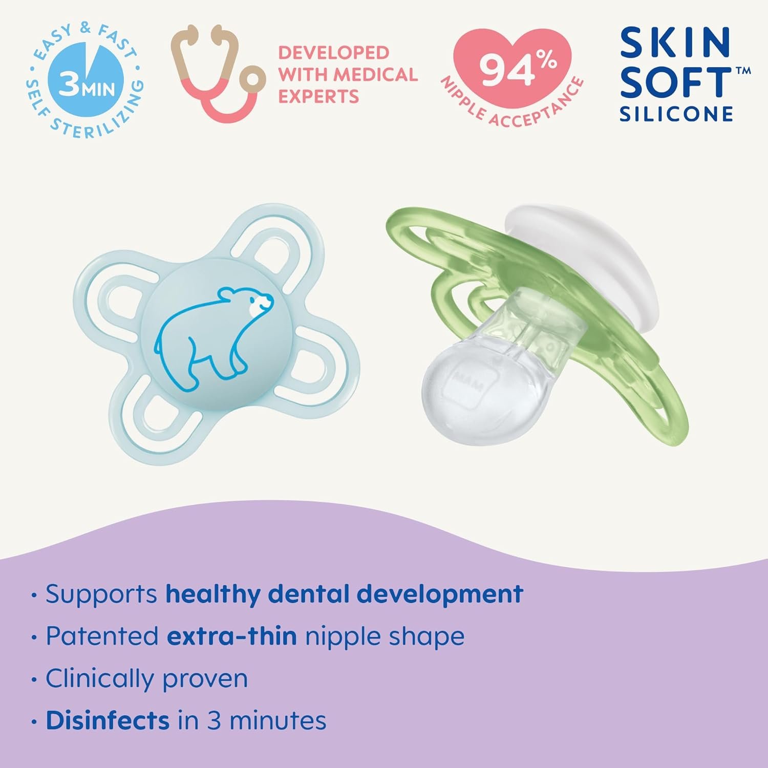 The MAM Perfect Pacifier for 0-6 months babies combines MAM’s most beloved features. It is 60% and 4x more flexible** than a regular pacifier and has a 94% nipple acceptance by babies***. It is clinically proven* to reduce the risk of open bite and increased overbite later in life. The wide openings on the pacifier shield create maximum air flow to protect baby’s sensitive skin and prevent irritation. Third, these glow in the dark pacifiers helps keep baby’s pacifier in sight. MAM’s medically engineered nipples feature life-like, SkinSoft textured silicone. Use the included self-sterilizing storage case to disinfect the pacifiers for up to 48 hours. Fill case with water, place pacifier in the case with the nipple facing down and follow package instructions for microwave setting. Cool completely before use. *Y. Wagner, R. Heinrich-Weltzien, “Effect of a thin-neck pacifier on primary dentition: a randomized controlled trial”, Orthodontics & Craniofacial Research, Vol. 19, Issue 3, pp. 127–136, August 2016.**Wild Hi-Precision Institute: the MAM nipple neck is approx. 60% thinner; University Clinic of Dentistry Vienna: approx. 4x more flexible than other pacifiers. (32% – 83% thinner / 1.1 – 19.5x more flexible). *** Market Research 2010-2019, tested with 1,463 babies.