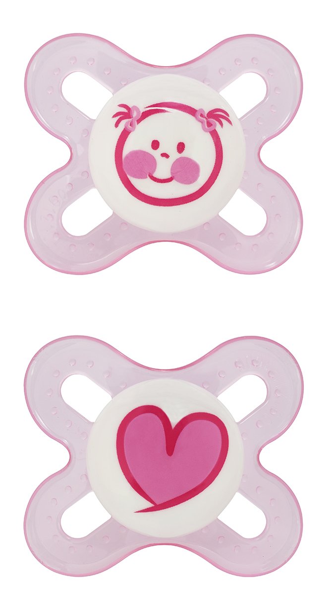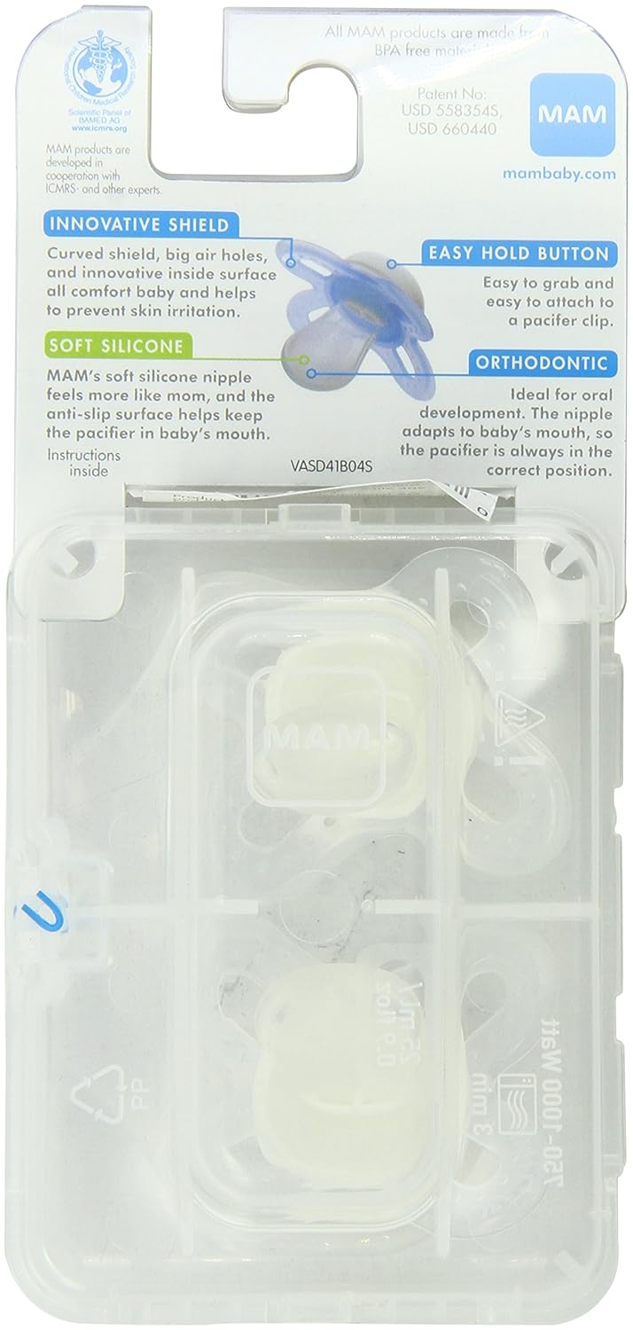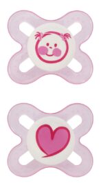 MAM start 0 and above months orthodontic pacifiers have been developed in cooperation with the International Children Medical Research Society and are recommended most by dentists and Orthodontists. MAM’s patented silk nipple is silicone with a difference: it’s silky soft. No other silicone feels softer. In cooperation with orthodontists, MAM designers have created this extra small and lightweight pacifier specifically for newborn babies. It is ideal for babies aged up to two months. To add a lovely detailed touch, the colors and motifs are adapted to reflect the baby’s age. The perfect start to a happy and healthy future. MAM pacifiers are always in the right position. For baby’s 0 and above months. 2 BPA free. You may receive this item in yellow, pink, purple or blue.