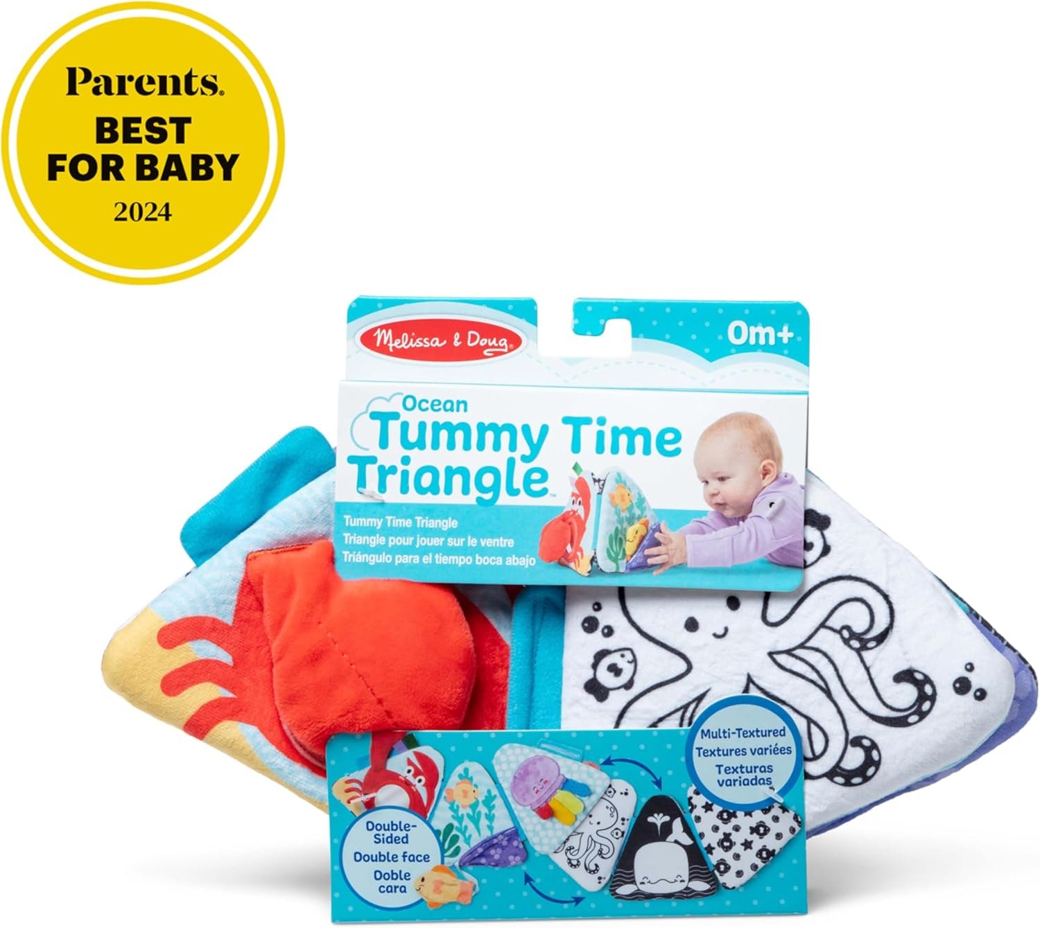 Make baby’s tummy time extra special with this engaging, double-sided folding cloth triangle toy! Three fold-out panels with adorable ocean-themed graphics and friendly characters lie flat or fold and connect into an upright pyramid. One side features high-contrast black and white graphics, great for important visual stimulation during baby’s first months. The other side includes colorful sea creatures with developmentally appropriate features, like a crab with a peek-a-boo mirror and squeaker, sensory tabs and ribbons on the jellyfish, and an attached tuck-away fish that stores in a pocket! The Tummy Time Triangle helps baby stay engaged and strengthen muscles during tummy play. It’s a great addition to registries and makes a great gift for newborns through six-month-olds for screen-free, hands-on interaction and skill-boosting play.