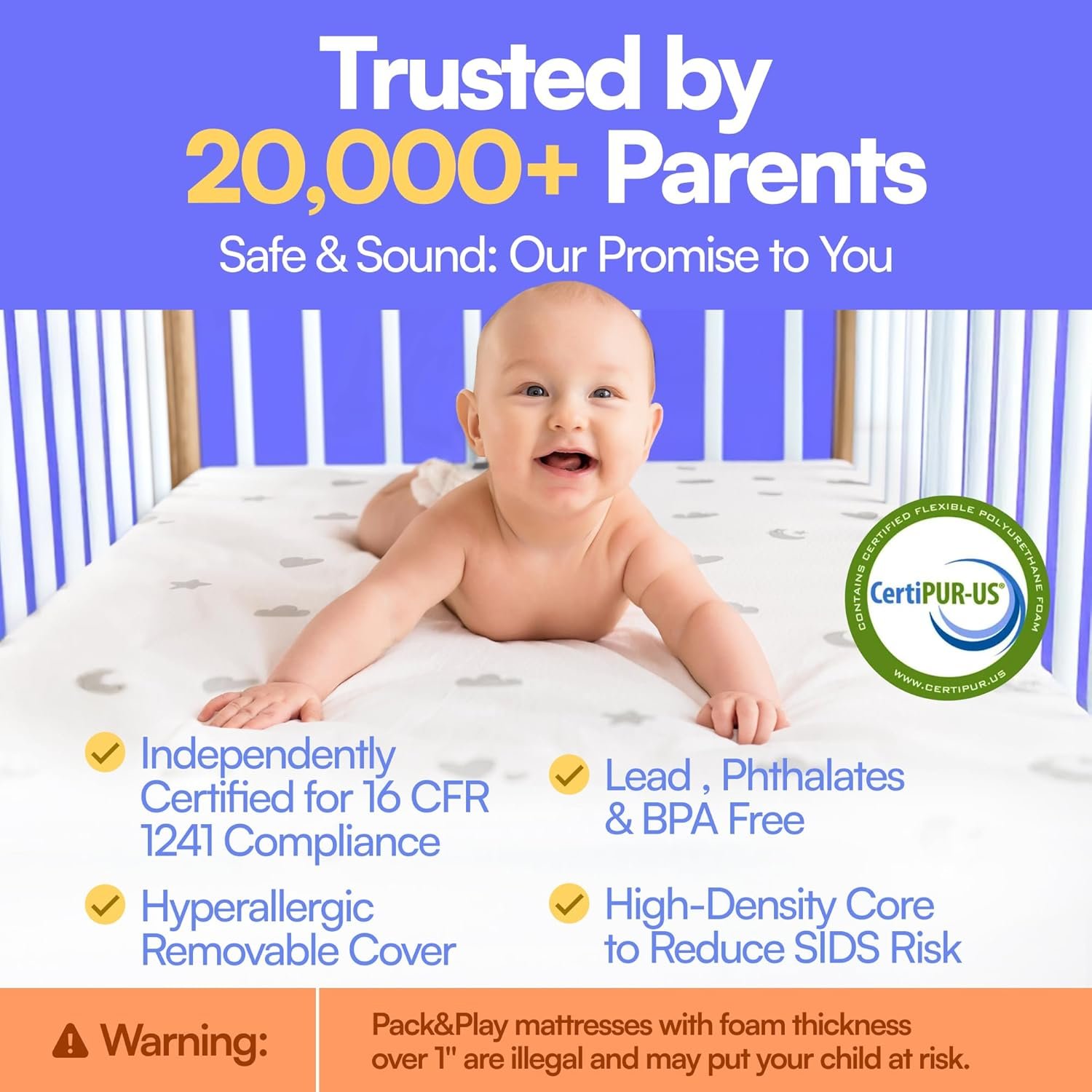 Cloud-like Comfort – Made of luxurious foam, our 38×26 mattress provides gentle support, is plush & cozy and cradles your baby’s delicate body for a restful and soothing sleep. Our pack&play mattress is porta crib approved.