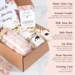 7PCS NEW MOM CARE PACKAGE AFTER BABY: Surprise the mom-to-be with this adorable Self-Care Gift Box! Includes: 1x cute “MAMA” glass, 1 x soothing lavender-scented candle, 1 x goat milk soap, 1 x luxurious milk bath bomb, 1 x coconut-flavored lip balm, 1 x heart-shaped bracelet (a sweet reminder of the love she’s growing), 1 x heartfelt “You’ll Be an Amazing Mommy” card (because she deserves all the encouragement!).