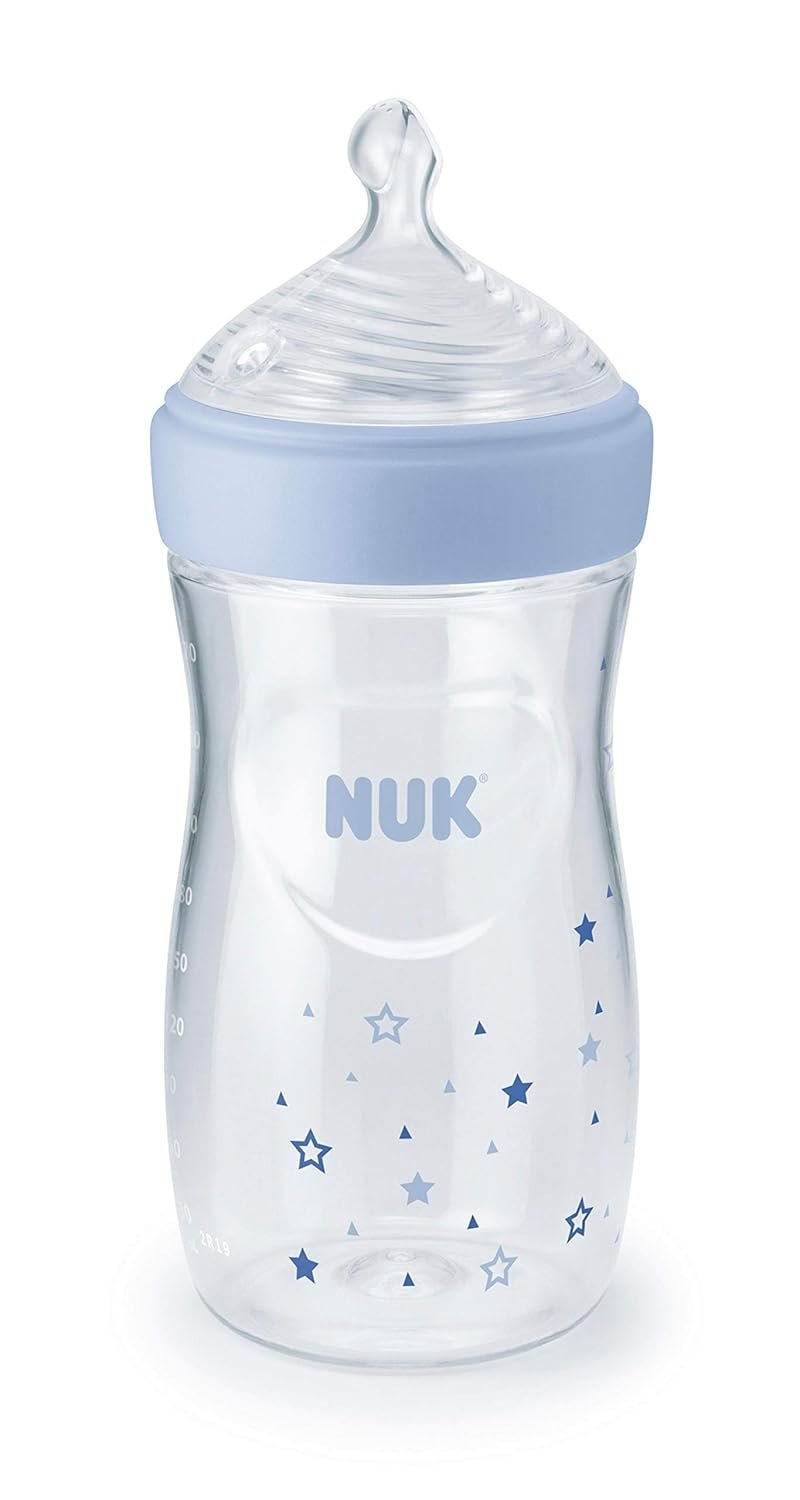 Now your baby can transition from breast to bottle in a natural way with the NUK® Simply Natural™ Bottles. Designed to mimic the fit, flow, and movement of mom as closely as possible, this is the only bottle with up to 9 nipple holes, just like mom. This provides a natural feeding experience to ensure the mom-baby bond remains strong. NUK® Simply Natural™ bottles feature a super-soft nipple that mimics the shape of mom’s breast while breastfeeding. The scoop nipple cavity allows space for baby’s tongue and jaw to move naturally, just like they do when breastfeeding. Now NUK® Simply Natural™ bottles feature SafeTemp technology, which lets you know when milk is too hot. The blue thermometer indicator fades when milk is too hot and reappears when milk has cooled and is safe to drink.