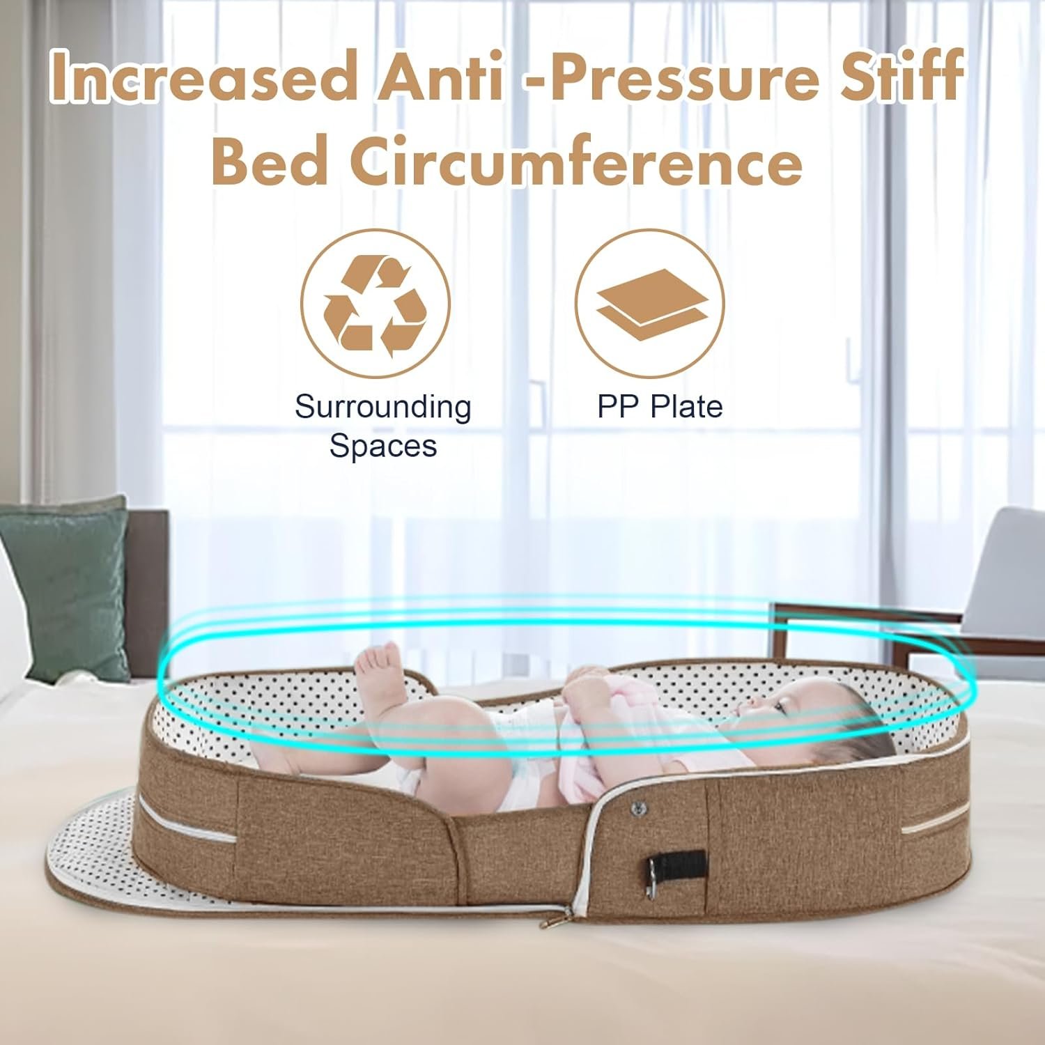【Anti -Pressure Co-Sleeping Bed】With our innovative ‘Baby Bassinet in Bed’ design, sleep safety is paramount. The added raised hard barrier prevents any accidental pressure during co-sleeping with parents, promoting peaceful nights and worry-free rest.