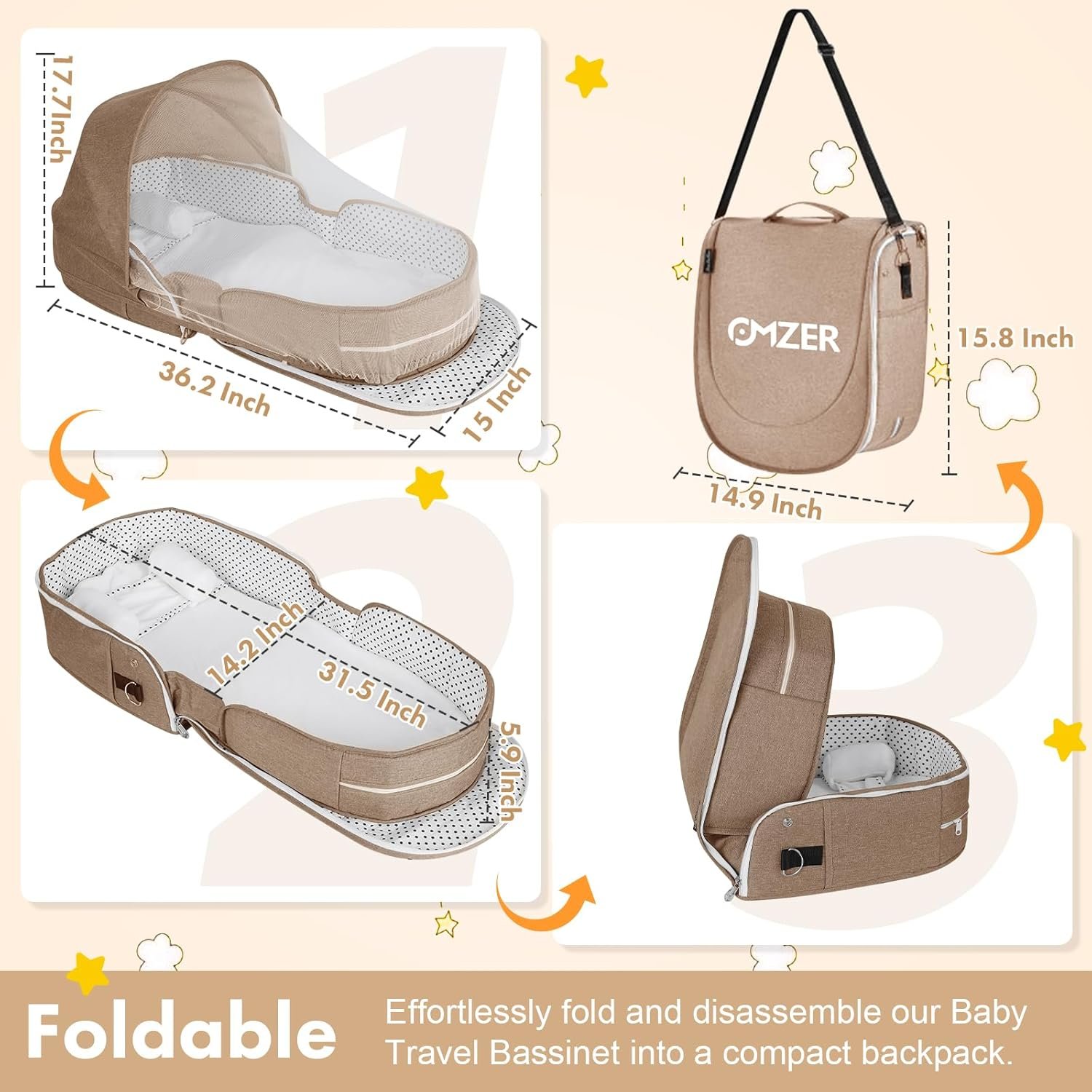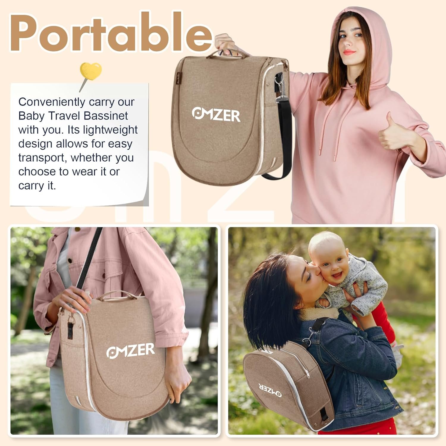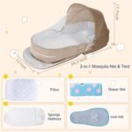 omzer Baby Travel Bassinet Portable – Foldable Carry Bag Bassinet Anti-Pressure Baby Co-Sleeping Bed Lightweight Infant Travel Bed with 2-1 Mosquito & Canopy Beige