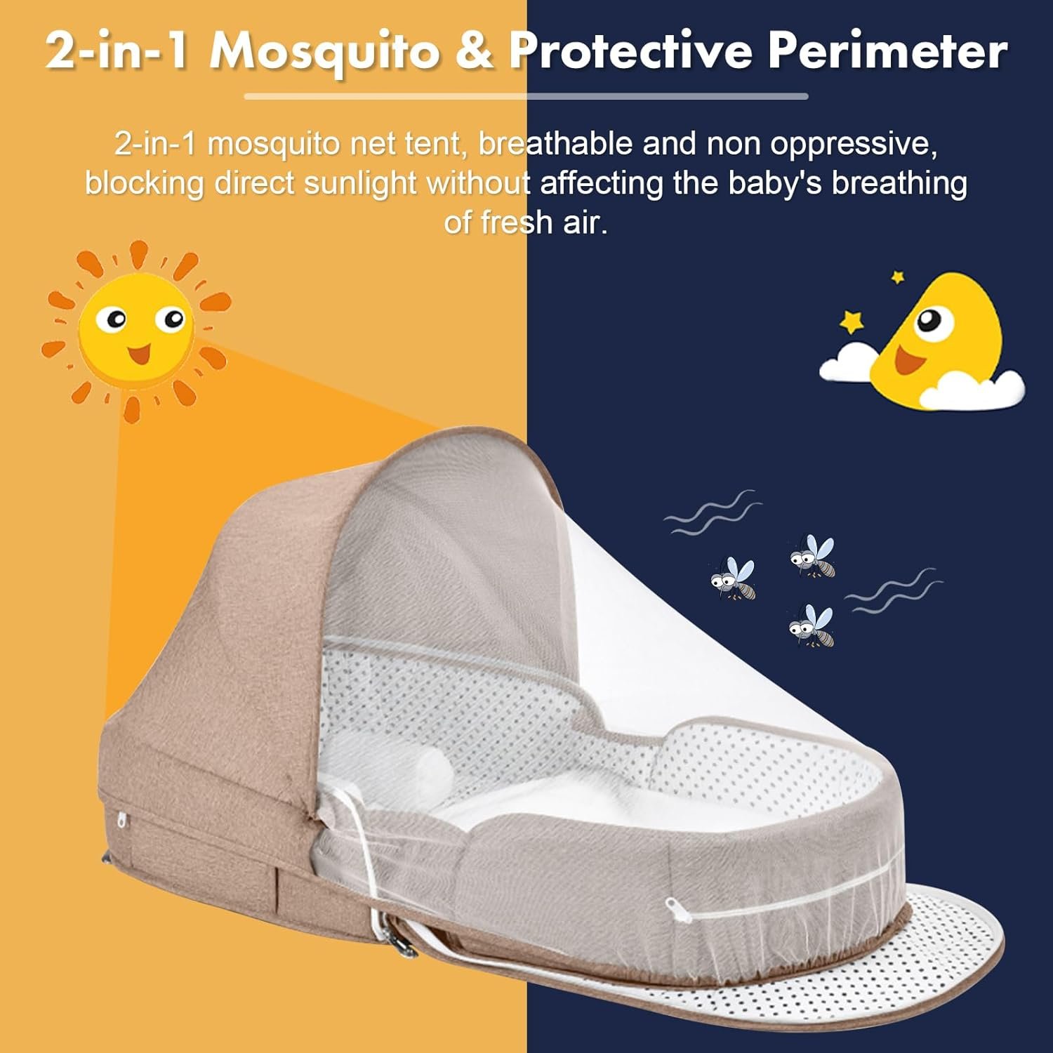 【Breathable & Shading】Our baby bed comes with a unique 2-in-1 combination of a sunshade and mosquito net. Its breathable structure protects your baby from direct sunlight while enabling proper airflow. Experience travel convenience like never before with our travel bassinet with mosquito net and canopy.
