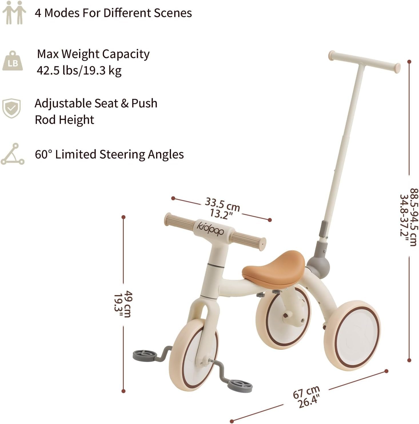 4-in-1 Versatile Baby Balance Bike – The Kidpop PONY transforms into a tricycle, push bike, balance bike, and scooter. Its adaptable design suits various environments, eliminating the need for new vehicles as your child grows
