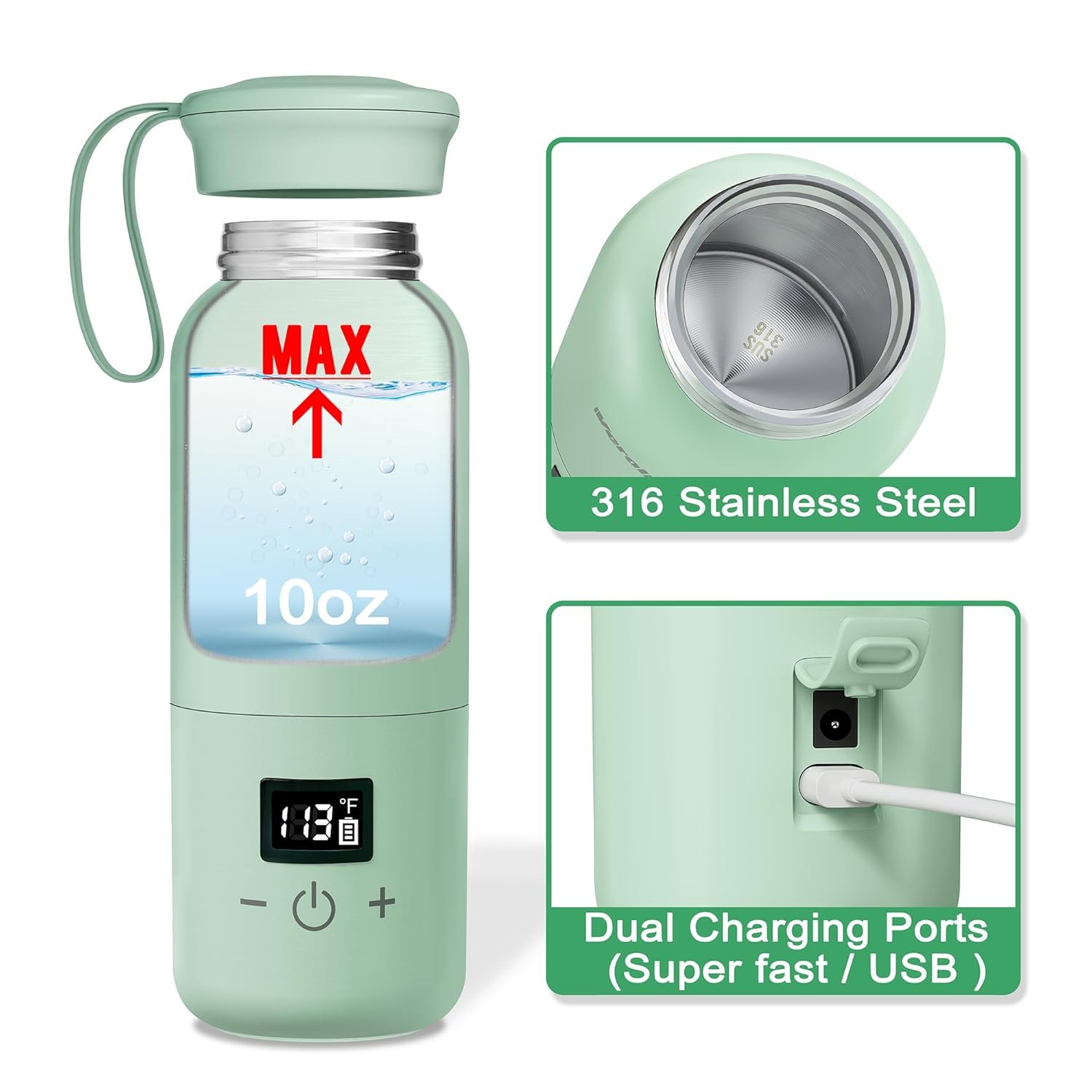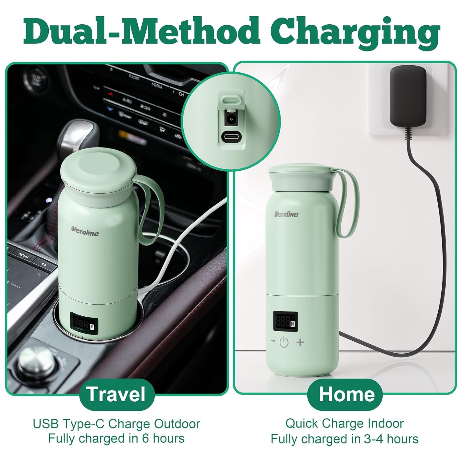 【Cordless Heating & Rechargeable】Our travel bottle warmer can heat up 10oz milk/water up to 5 times after fully charged. Equipped with super charging power adapter, the portable milk warmer could be charged in 2-3 hours. With a Type-C / AC dual charging port, you can charge it in car, mobile power or any USB port.