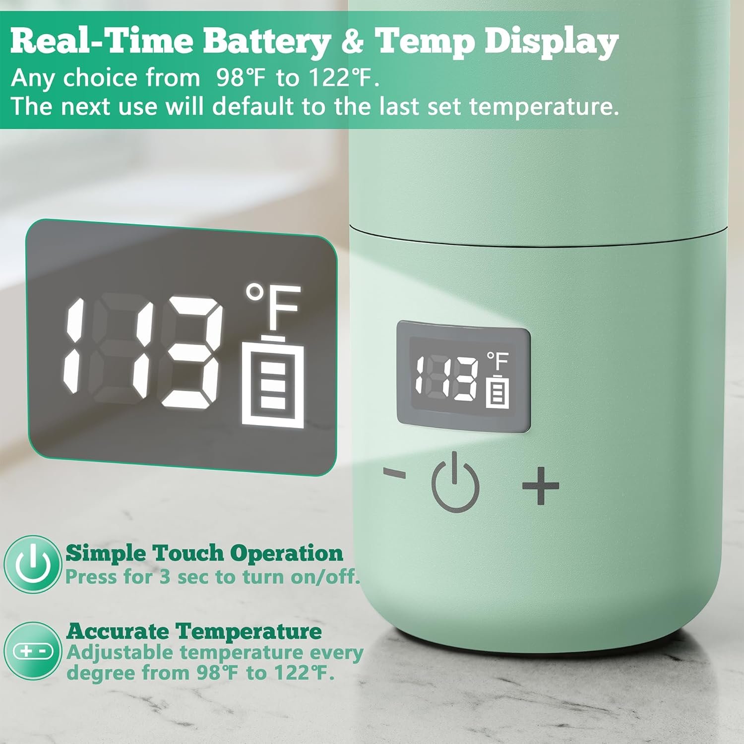 【Accurate Temp Control & Display】Our baby bottle warmer has an has an easy-to-use panel that precisely adjusts the heating temperature to every degree from 98°F to 122°F. The smart LED screen displays the current temperature and the battery capacity in real time, allowing you to instantly monitor.