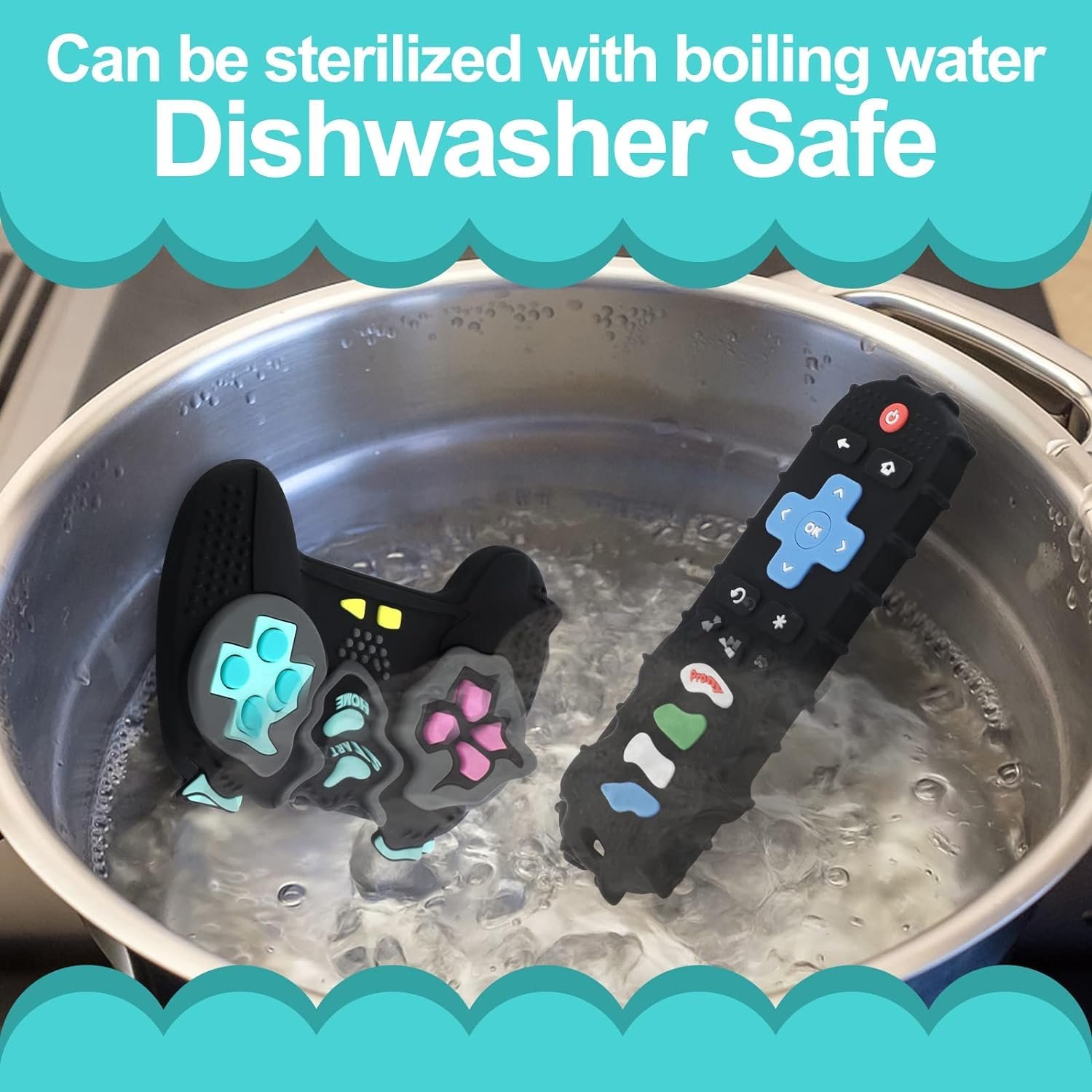Safe Material — PRONY silicone TV remote control and game controller teething toys are made of 100% food grade silicone,BPA free,CPC-certified.