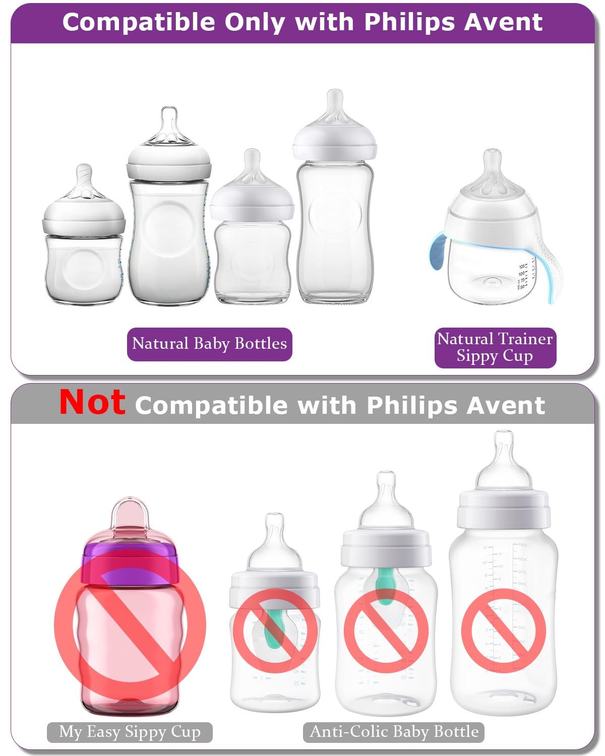 This nipple is compatible with Avent Natural baby bottles and most similar-sized bottles. Please check the dimensions before purchasing to ensure a perfect fit.