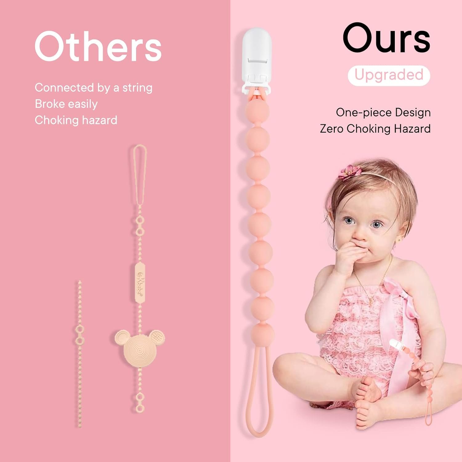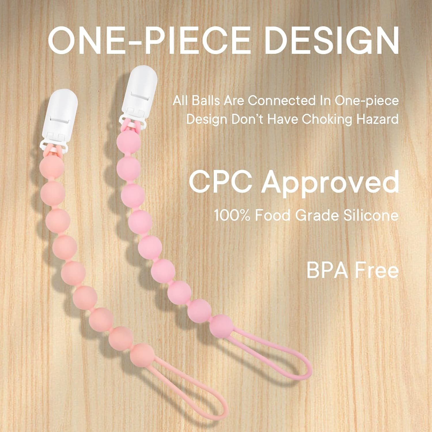 【Unique Design】The plastic clasp of the pacifier clip is durable and rust-free, and the plastic clasp of the pacifier clip is soft and secure without damaging clothing or babies.One-piece design of silicone pacifier clip is more safer for baby to use and don’t have any choking hazard. The balls of silicone paicifier holder are suitable for babies to teeth.