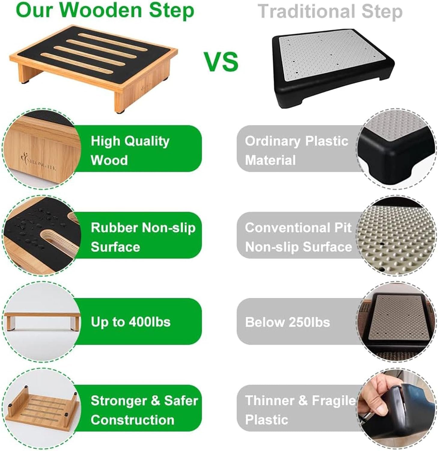 High-Quality Wooden Step Stool, Supports Up to 400 lbs: Measuring 15 3/4″ x 12 5/8″ x 3 1/2″, this premium wooden step stool is crafted for durability and strength, supporting up to 440 lbs. Perfect for use as a bathroom step stool, bedside aid, or car entry support, offering a safe and reliable option for daily use.