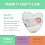 This swaddle is part of Stage 1 in the SwaddleMe Stages of Sleep, made for newborns who aren’t rolling over yet and like to be swaddled with their arms in