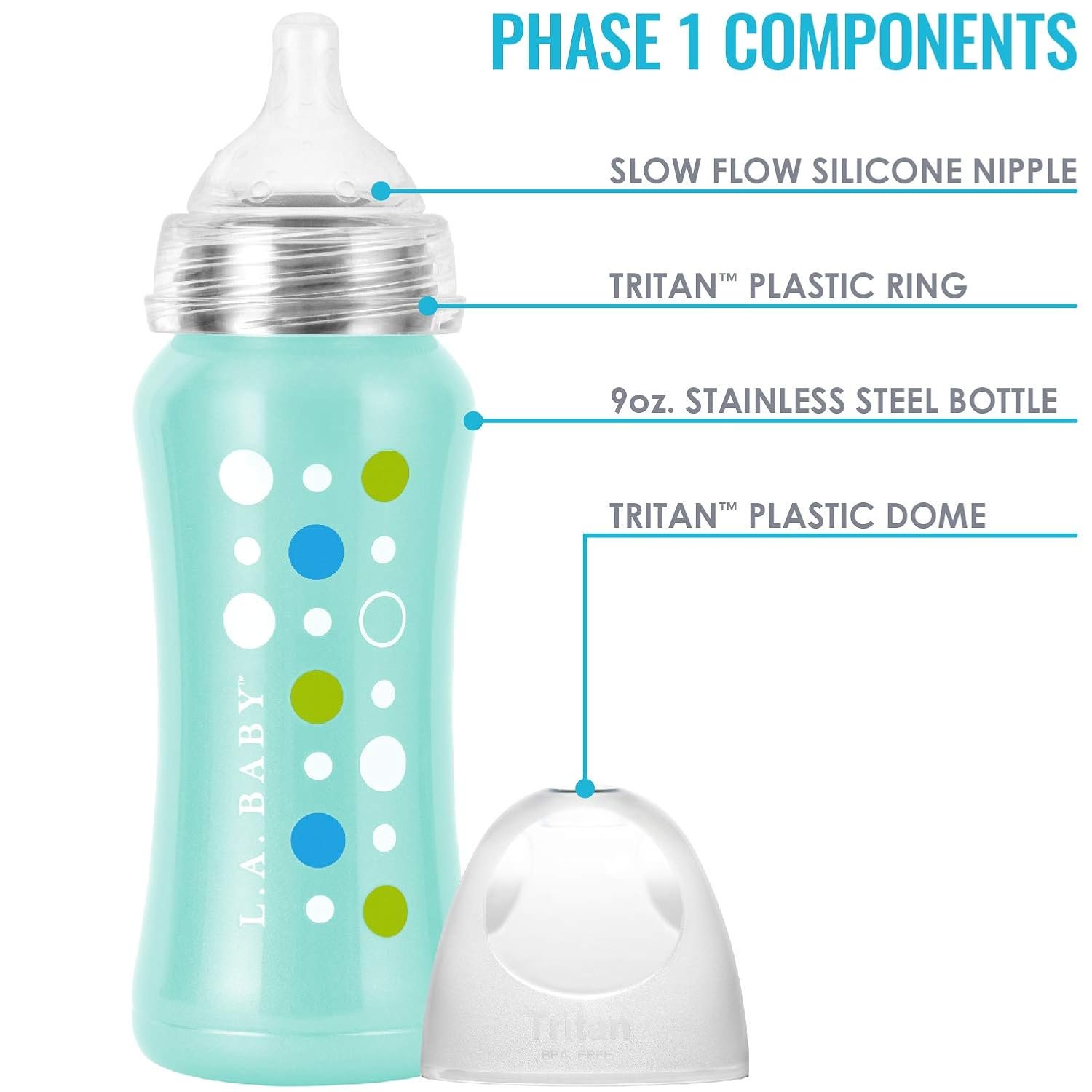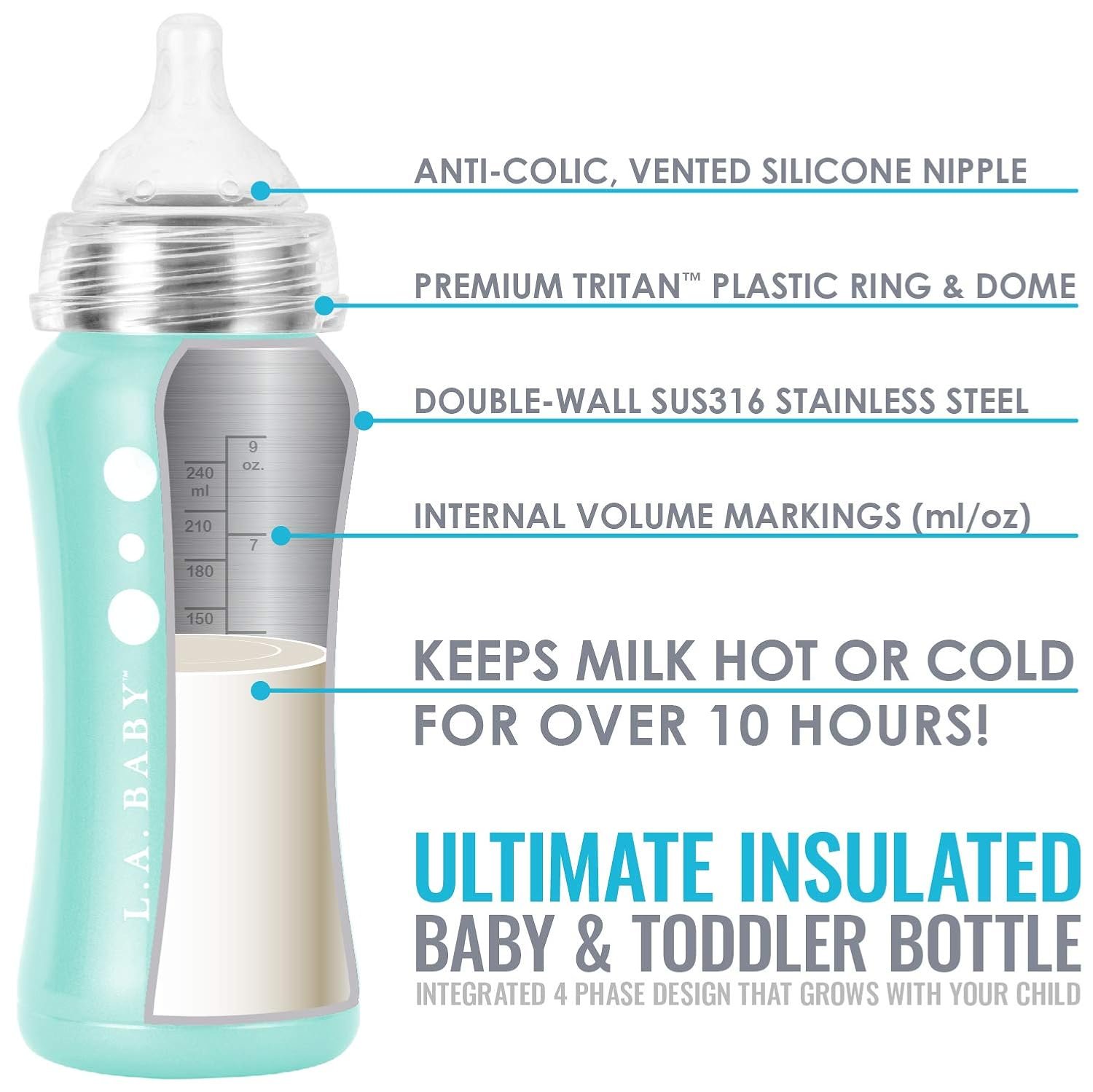 LEAK-FREE, SAFE, GROW-WITH-ME COMPATIBILITY – PHASE 1 | The LA Baby stainless steel baby bottle is extra durable, lightweight, insulating, leak-free and 100% recyclable. Wide-neck opening for HASSLE-FREE CLEANING. Extend the life of your bottle with our compatible sippy cup and toddler straw, handle and carry strap (Sold separately).