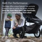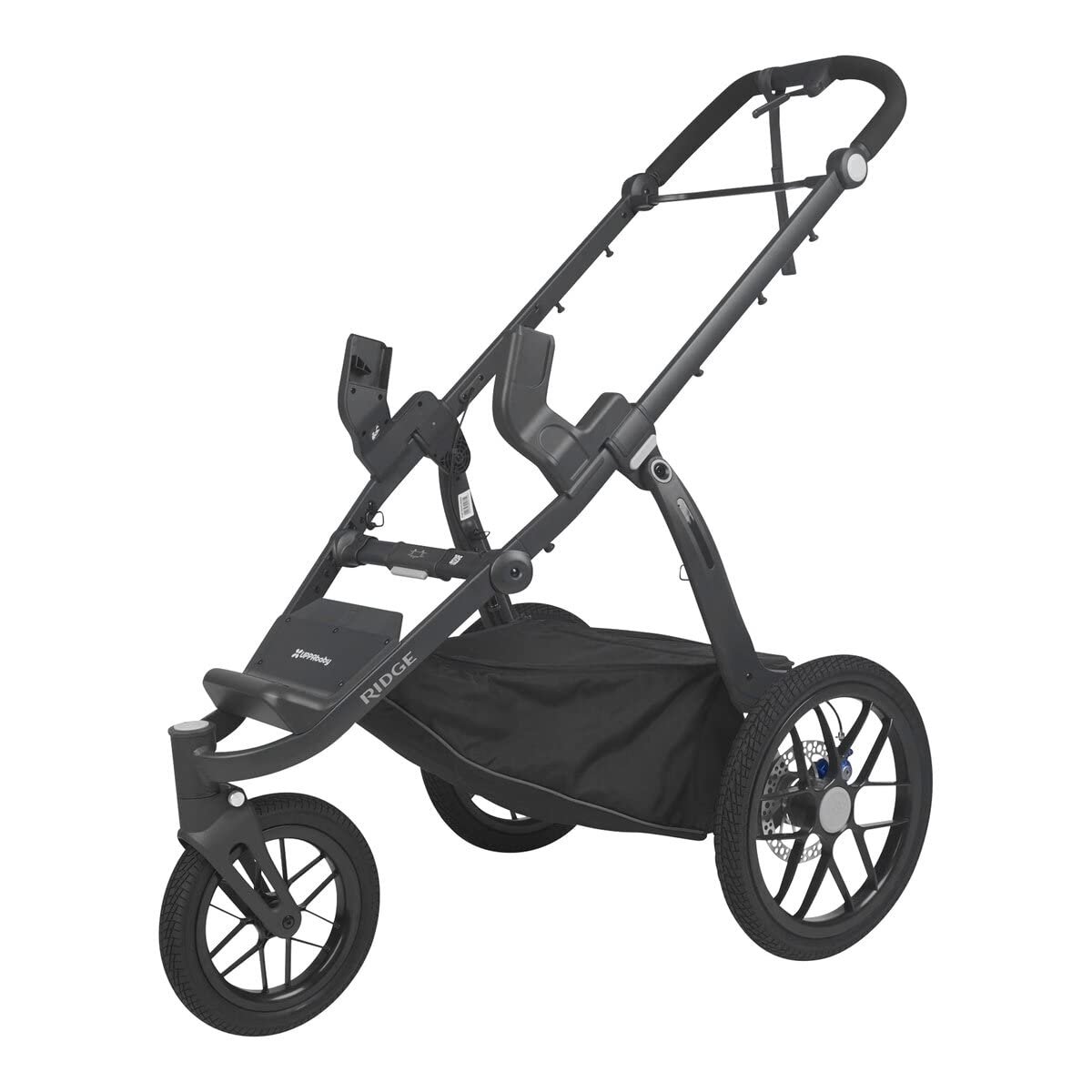 Go the extra distance with the UPPAbaby RIDGE All-Terrain jogging stroller. Whether you’re a runner, walker, or simply enjoy exploring the outdoors, the RIDGE is optimized for performance to keep you active as a family.• Advanced Responsive Suspension with a patented two-stage system provides a comfortable ride no matter the child weight or terrain• 12” x 16” EVA foam filled tires, eliminates the need to carry an air pump• Disc hand brake system provide advance responsiveness when going downhill or uneven ground surface• Swivel front wheel with lock out and adjustable tracker for jogging mode• One hand fold, stands when folded• XL Adjustable canopy with a zip out UPF 50+ sunshade for more sun protection• Canopy zipper pocket with headphone jack for phone storage• 5-point, no rethread padded harness with lumbar support• Multi-Position, webbing recline with mesh viewing window and cover flap• Water bottle holder included• Covered storage basket with built in pockets and additional bottle holder, hold up to 20 lbs.• Deep padded seat for maximum comfort with side storage pockets for small items• Wrist strap included for safety while jogging• Performance fabrics with water-repellant application• Reflective details on frame and basket to provide added visibility• Infant car set compatible (with adapters sold separately)