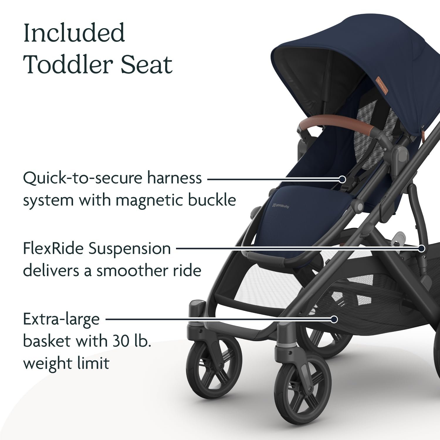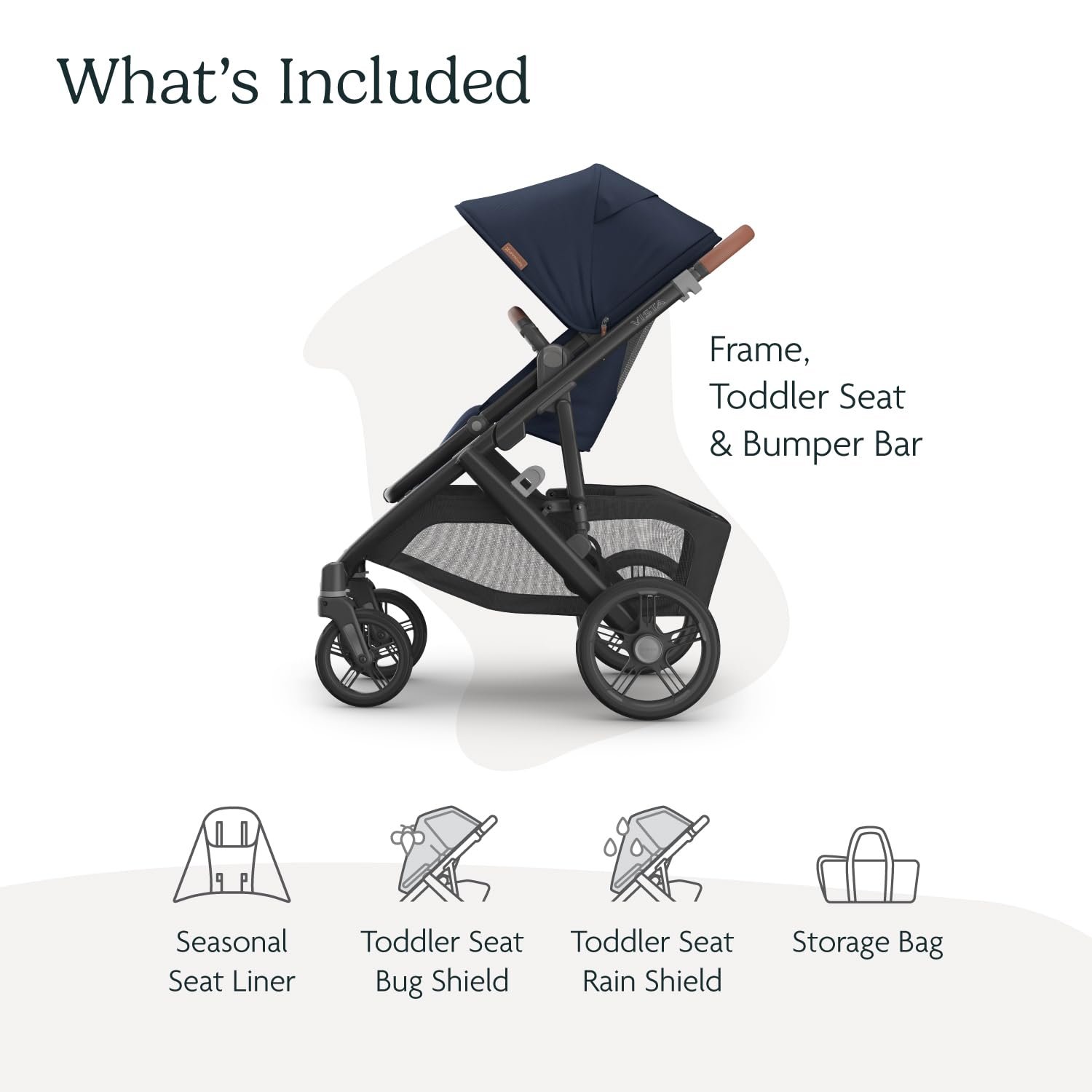 With its intuitive design and over 30 ways to customize your ride, the reimagined Vista V3 Stroller was designed to effortlessly fit every growing family, from first child to last. Starting as a single stroller, it easily transforms to accommodate up to three children, offering the epitome of portability and convenience. The Vista V3 provides the most premium ride through every season. – Effortlessly folds in one simple step & stands when folded for compact storage – Extendable, water-repellent UPF 50+ canopy and easy-to-peek window for added air flow – Extra-large, easy-access basket with 30 lb. weight limit to easily store all your essentials while strolling – Premium fabrics and full-grain REACH certified leather details – The Bassinet, Mesa, and Aria Infant Car Seats attach directly to stroller without adapters to create a from-birth solution Toddler Seat / Frame – Effortlessly folds in one simple step & stands when folded for compact storage – Extendable, water-repellent UPF 50+ canopy and easy-to-peek window for added air flow – Extra-large, easy-access basket with 30 lb. weight limit to easily store all your essentials while strolling – Premium fabrics and full-grain REACH certified leather details – Never flat tires for durability and smooth strolling through various terrain – Reflective trims on wheels and basket to enhance visibility while strolling – Ability to transport up to three children with RumbleSeat and PiggyBack accessories – One-handed multi-position recline for those resting strolls – Extendable water-repellant canopy with UPF 50+ protection, zip-out fabric, and mesh panels with covering for added protection for any weather – One-hand, adjustable handlebar to better accommodate different heights – Front wheel locks with visual indicators for parents peace of mind – Adjustable footrest positions feet and legs comfortably as they grow – GREENGAURD Gold certified to suppose healthier air quality & low chemical emissions