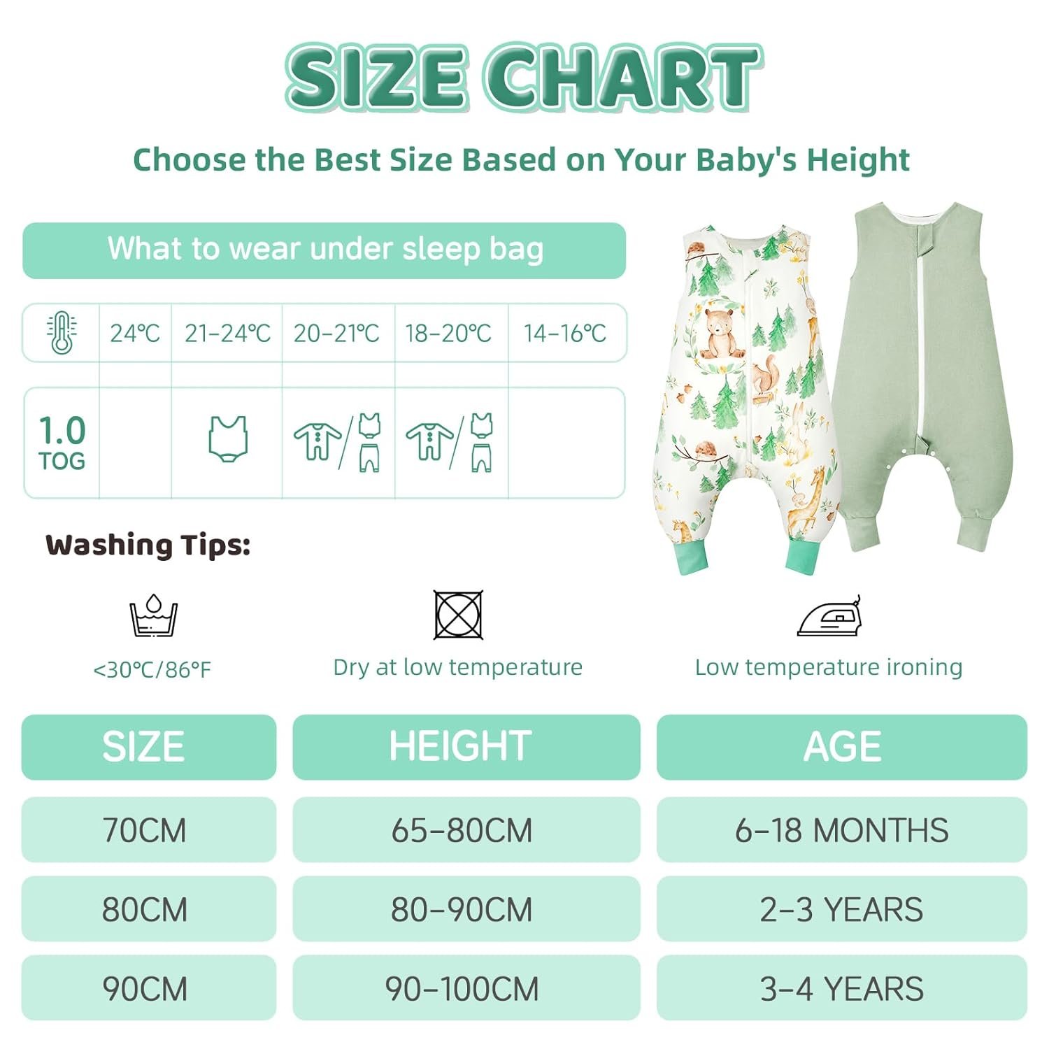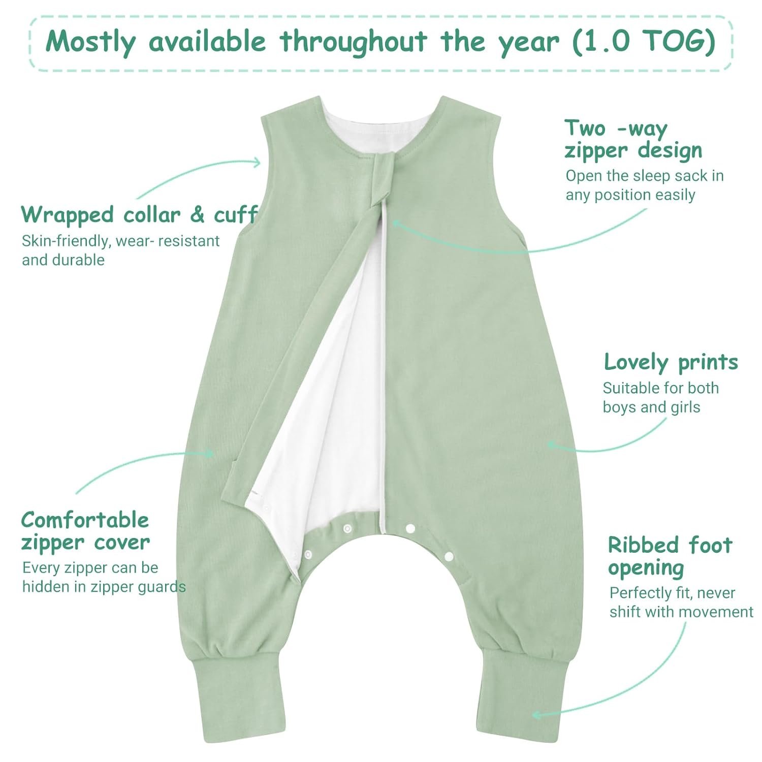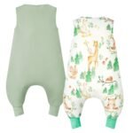 2 Pack Sleeveless baby sleep sack: 1.0 TOG baby sleeping bag with legs offers the best thermal resistance and is ideal for room temperatures between 20-24°C. It is suitable for spring, summer and fall. The baby sleep sack can be worn on its own or with pyjamas.