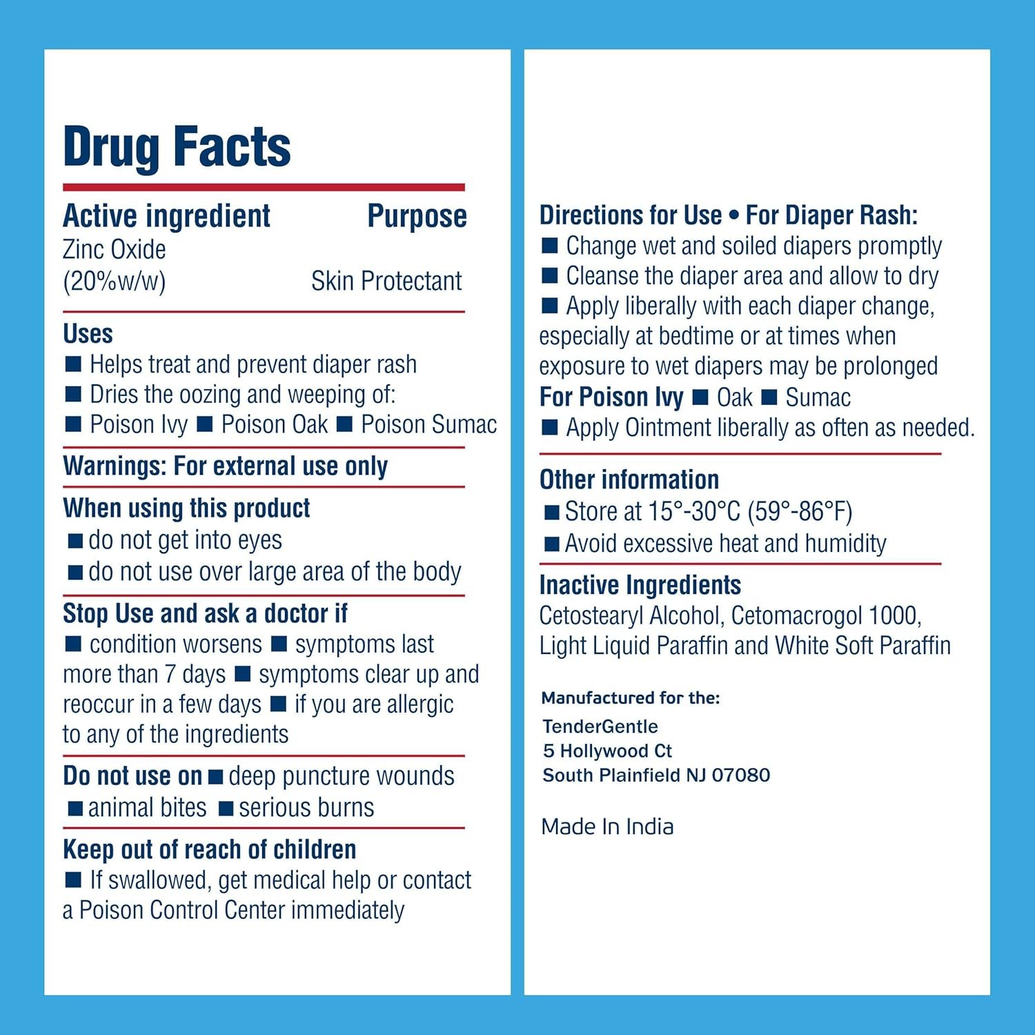 Our ointment contains 20% of zinc oxide and comes in a 1 oz. tube. Store at 59-86 degrees Fahrenheit (15-30 degrees Celsius).